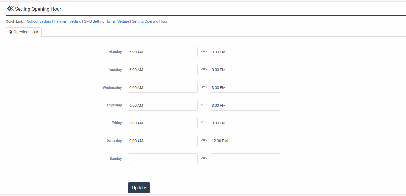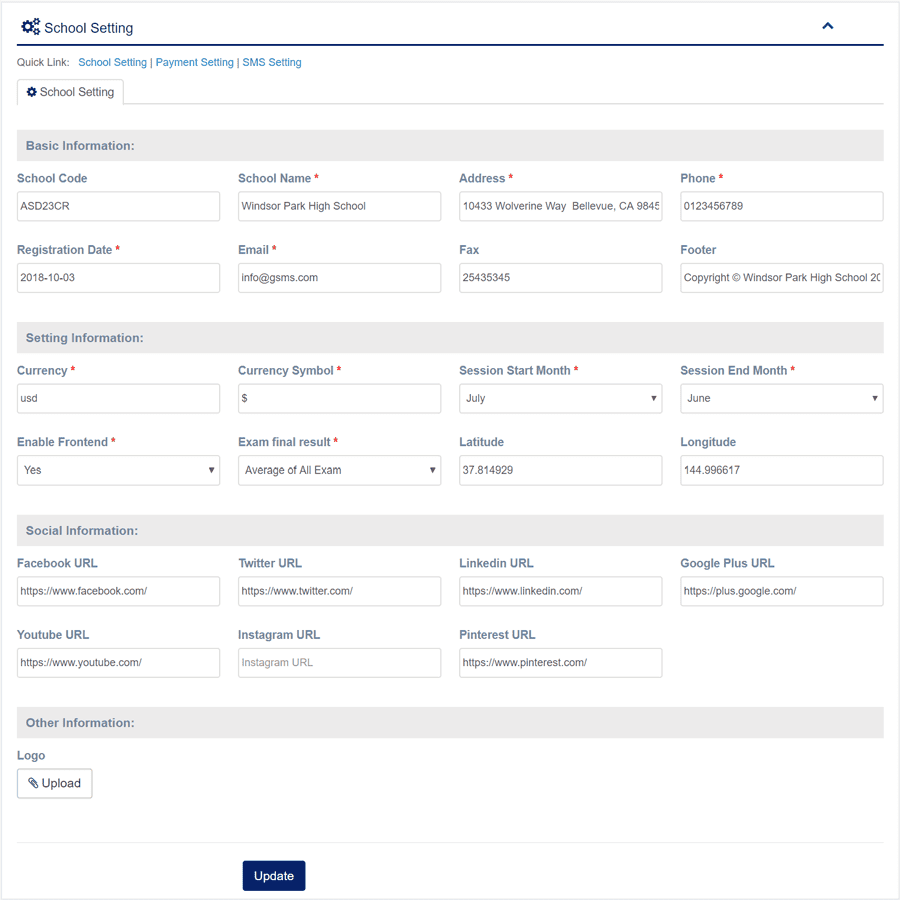 1. Login to System Admin Panel. 2. Select School Setting sub menu under Setting menu from left side bar. 3. Fill up all required fields as per expected value/data. 4. Then Click to Update Button. 5. You are done with School Settings.