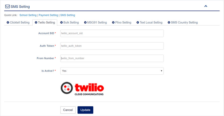 1. Login to System Admin Panel. 2. Select SMS Setting sub menu under Setting menu from left side bar. 3. Fill up all required fields as per expected value/data. 4. Then Click to Update Button. 5. Same way follow all SMS gateway setting. 6. You are done with SMS Settings.