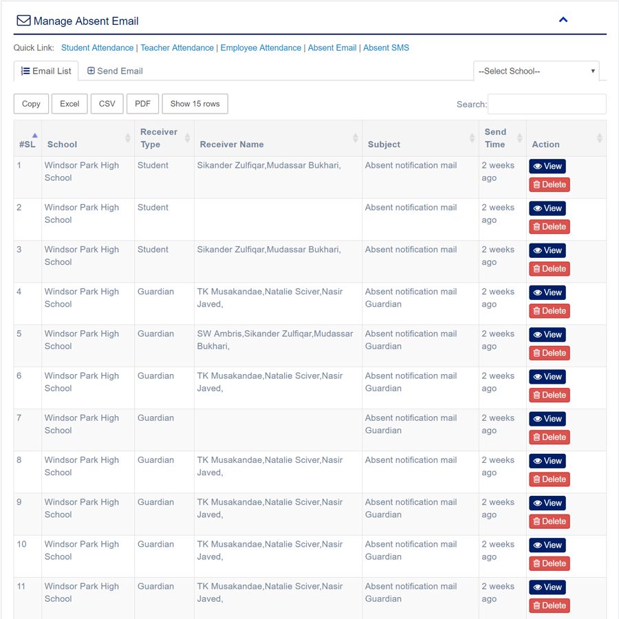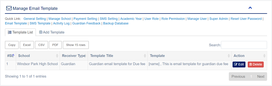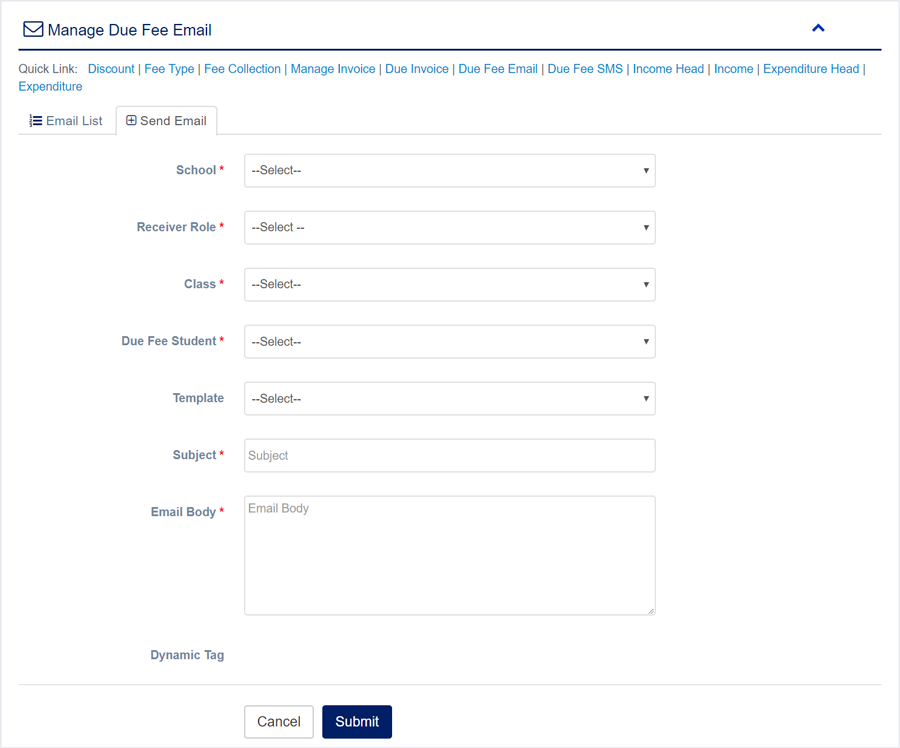 1. Login to System Admin Panel. 2. Select Due Fee Email sub menu under Accounting main menu from left side bar. 3. To View Due Fee Email Click View button in the Due Fee Email list. 4. To Delete Due Fee Email Click Delete button in the Due Fee Email List. 5. You are done with Manage Due Fee Email feature.