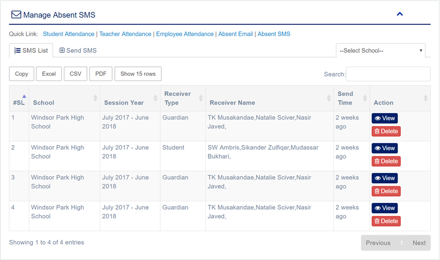1. Login to System Admin Panel. 2. Select Absent SMS sub menu under Attendance main menu from left side bar. 3. To Send Absent SMS Click Send SMS tab in the page. 4. To Delete Absent SMS Click Delete button in the Absent SMS List. 5. You are done with Absent SMS feature.