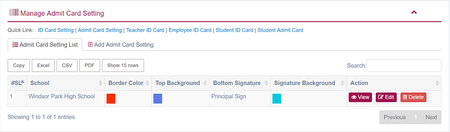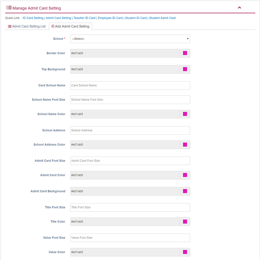 1. Login to System Admin Panel. 2. Select Admit Card Setting sub menu under Generate Card main menu from left side bar. 3. To Add/Create new Admit Card Setting click Add Admit Card Setting tab. 4. To Edit Admit Card Setting Click Edit button in the Admit Card Setting list. 5. To Delete Admit Card Setting Click Delete button in the Admit Card Setting List. 6. You are done with Manage Admit Card Setting feature.