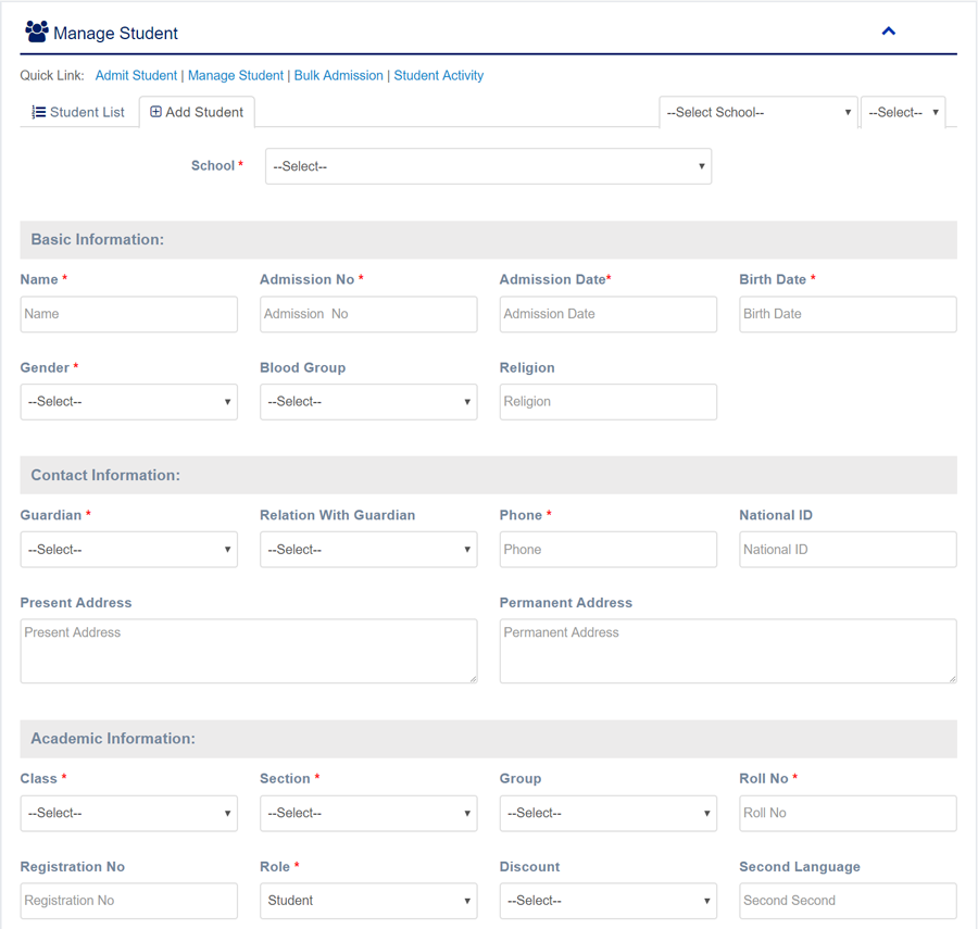 1. Login to System Admin Panel. 2. Select Admit Student sub menu under Student main menu from left side bar. 3. To Add/Create new Student Please fill up the form and click submit button. 4. You are done with Manage Guardian feature.