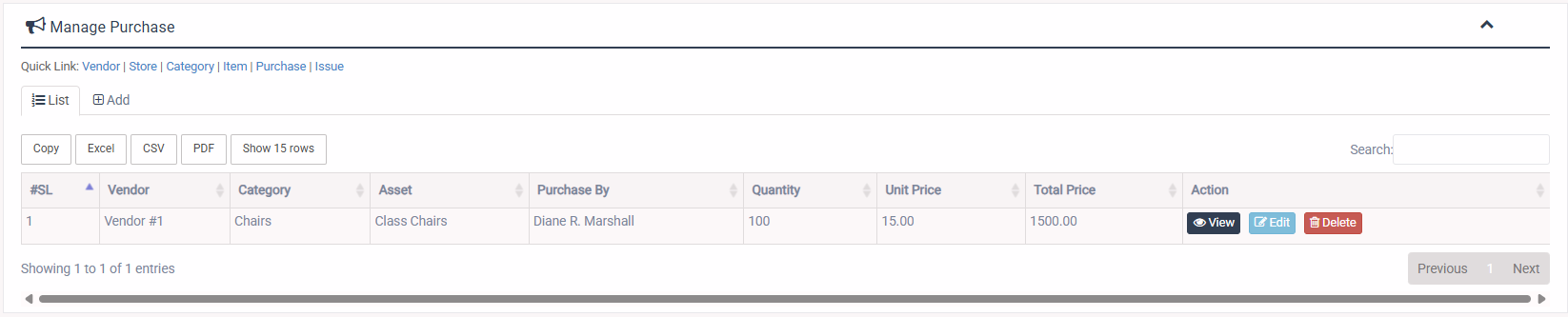 1. Login to System Admin Panel. 2. Select Purchase sub menu under Asset Management main menu from left side bar. 3. To Add/Create new Purchase click Add Book tab. 4. To Edit Purchase Click Edit button in the Purchase list. 5. To Delete Purchase Click Delete button in the Purchase List. 6. You are done with Manage Purchase feature.![]()