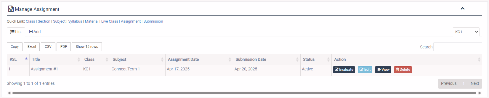 1. Login to System Admin Panel. 2. Select Assignment sub menu under Academic main menu from left side bar. 3. To Add/Create new Assignment click Add tab. 4. To Edit Assignment Click Edit button in the Study Material list. 5. To Delete Assignment Click Delete button in the Study Material List. 6. You are done with Assignment feature. Instruction: Please add Class & Subject before add Assignment.