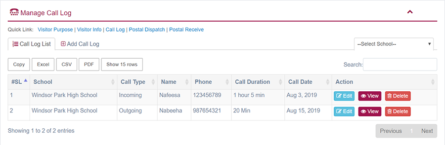 1. Login to System Admin Panel. 2. Select Call Log sub menu under Front Office menu from left side bar. 3. To add/create new Visitor Info click Add Call Log tab. 4. To edit Call Log Click Edit button in the Call Log list. 5. To Delete Call Log Click Delete button in the Call Log list. 6. You are done with Call Log feature.