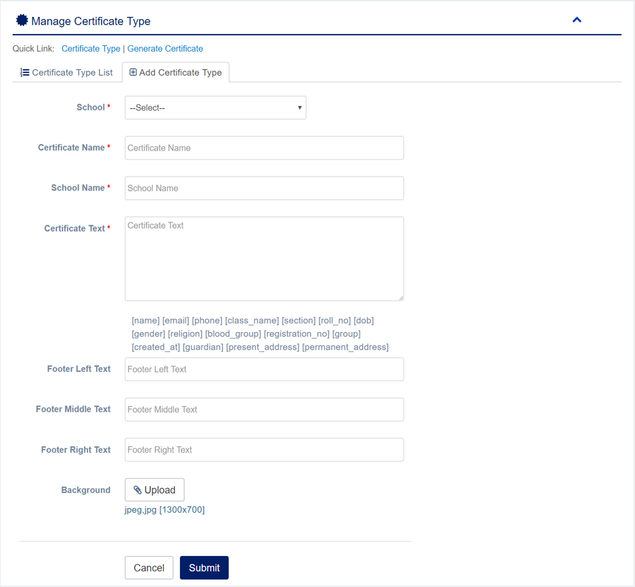 1. Login to System Admin Panel. 2. Select Certificate Type sub menu under Certificate main menu from left side bar. 3. To Add/Create new Certificate Type click Add Certificate Type tab. 4. To Edit Certificate Type Click Edit button in the Certificate Type list. 5. To Delete Certificate Type Click Delete button in the Certificate Type List. 6. You are done with Manage Certificate Type feature.