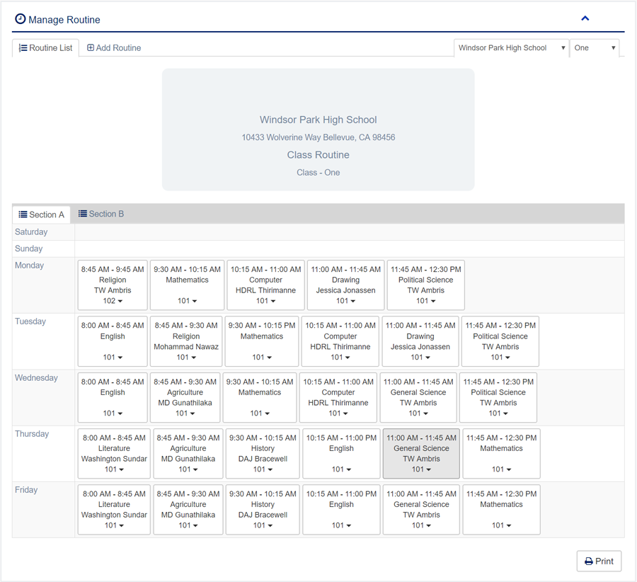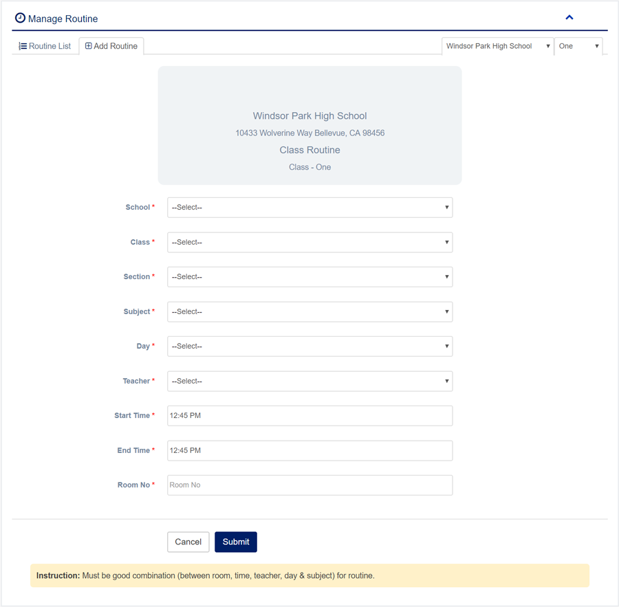 1. Login to System Admin Panel. 2. Select Class sub menu under Class Routine main menu from left side bar. 3. To Add/Create new Class Routine click Add Class Routine tab. 4. To Edit Class Routine Click Edit button in the Class Routine list. 5. To Delete Class Routine Click Delete button in the Class Routine List. 6. You are done with Manage Class Routine feature. Instruction: Must be good combination (between room, time, teacher, day & subject) for routine.