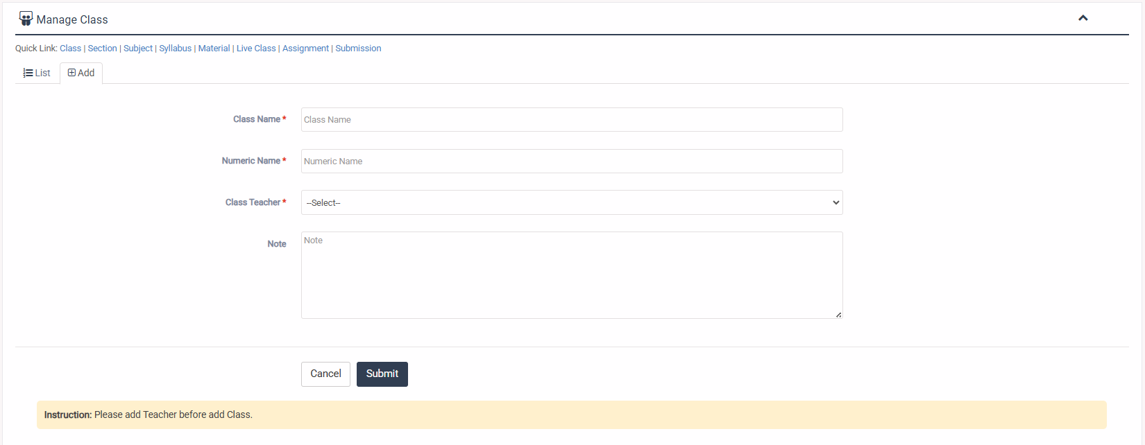 1. Login to System Admin Panel. 2. Select Class menu under Academin main menu from left side bar. 3. To Add/Create new Class click Add Class tab. 4. To Edit Class Click Edit button in the Class list. 5. To Delete Class Click Delete button in the Class List. 6. You are done with Manage Class feature. Instruction: Please add Teacher before add Class.