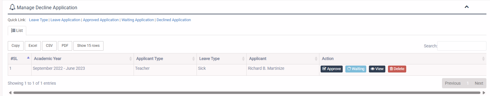 1. Login to System Admin Panel. 2. Select Declined Application sub menu under Manage Leave menu from left side bar. 3. Admin can view, approve, put in waiting or delete the declined application. 4. You are done with Declined Application feature.