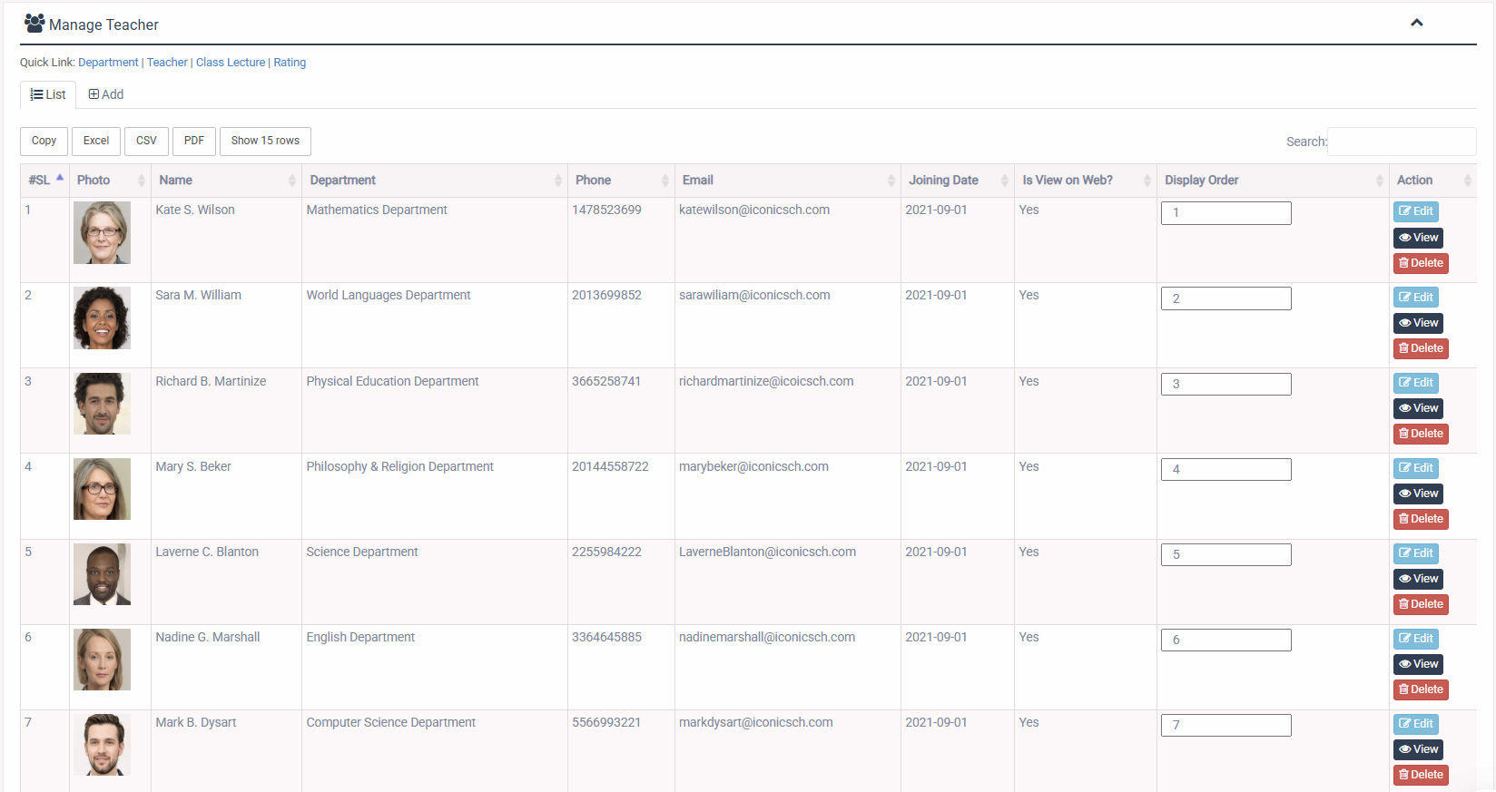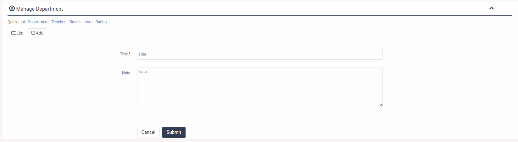 1. Login to System Admin Panel. 2. Select Department menu from left side bar. 3. To Add/Create new Department click Add tab. 4. To Edit Department Click Edit button in the Teacher list. 5. To Delete Department Click Delete button in the Teacher List. 6. You are done with Department feature.![]()