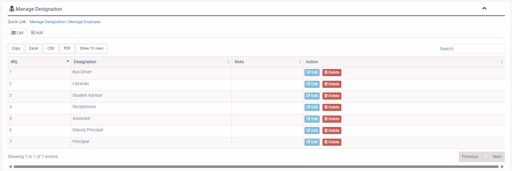 1. Login to System Admin Panel. 2. Select Manage Designation sub menu under Human Resource menu from left side bar. 3. To Add/Create new Designation click Add Designation tab. 4. To Edit Designation Click Edit button in the Designation list. 5. To Delete Designation Click Delete button in the Designation List. 6. You are done with Manage Designation feature.