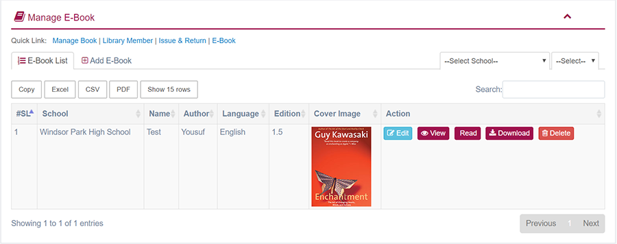 1. Login to System Admin Panel. 2. Select E-Book sub menu under Library main menu from left side bar. 3. To Add new E-Book click Add E-Book tab. 4. To Edit E-Book Click Edit button in the E-Book List. 6. You are done with Manage E-Book feature.