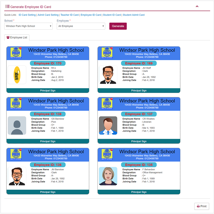 1. Login to System Admin Panel. 2. Select Teacher ID Card sub menu under Generate Card main menu from left side bar. 3. Then choose Teacher and click Find button to get Teacher ID Card list 4. You are done with generate Teacher ID Card feature.