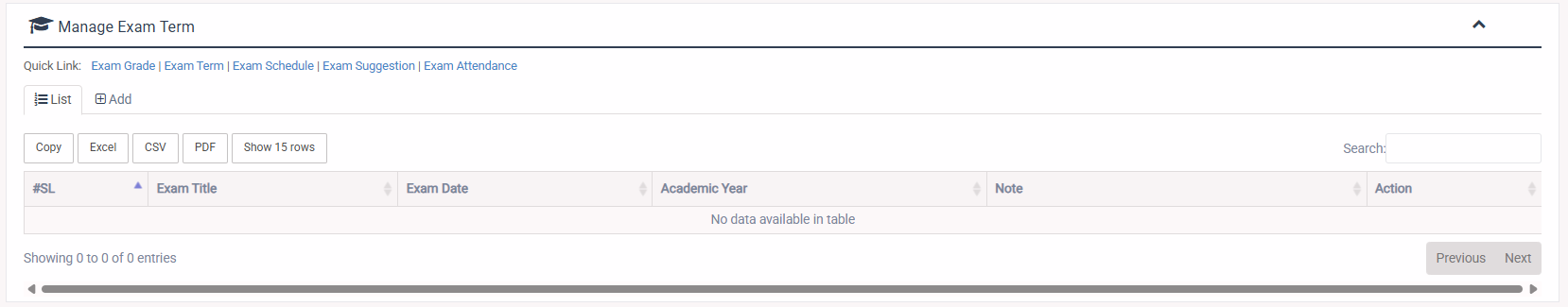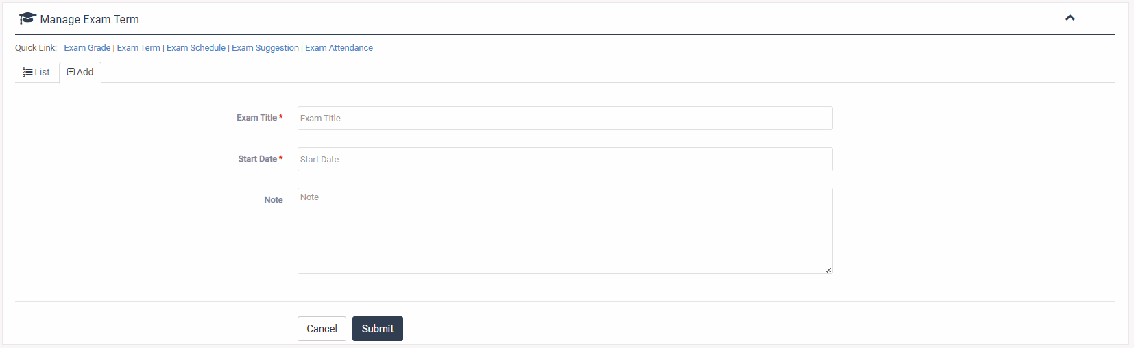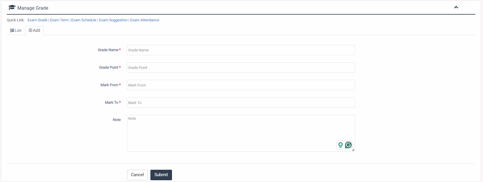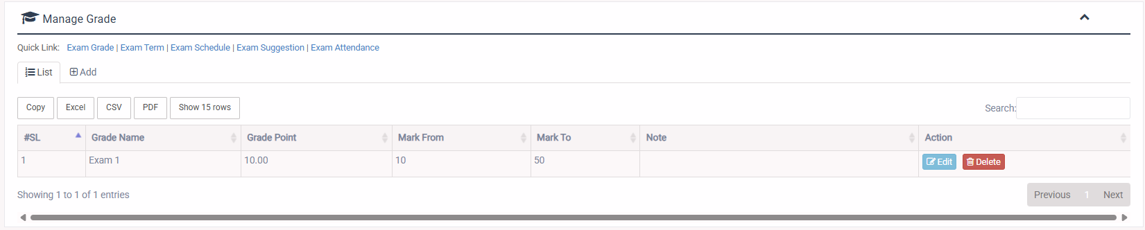 1. Login to System Admin Panel. 2. Select Exam Grade sub menu under Manage Exam main menu from left side bar. 3. To Add Exam Grade select Add button. 4. To Edit Exam Grade select Edit button. 5. To Delete Exam Grade select Delete button. 6. You are done with Exam Grade feature.