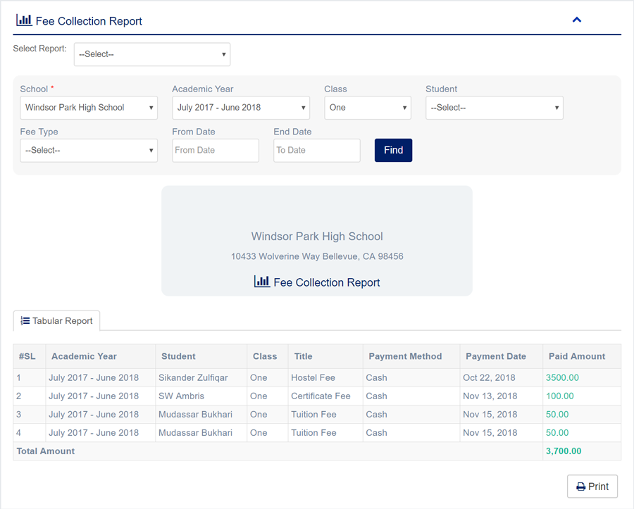 1. Login to System Admin Panel. 2. Select Fee Collection Report sub menu under Report main menu from left side bar. 3. To View Fee Collection Report choose Academic Year, Class, Student, Fee Type, From Date and To date and click find Button. 4. You are done with Manage Fee Collection Report feature.