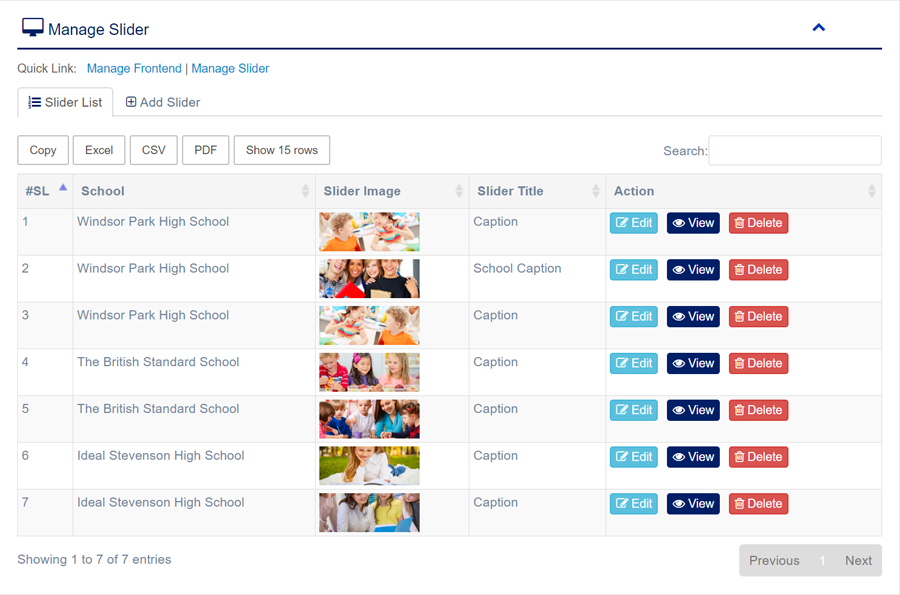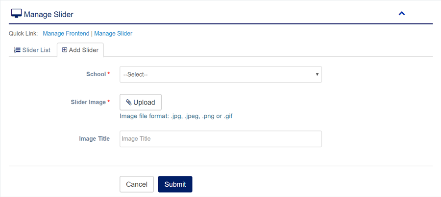 1. Login to System Admin Panel. 2. Select Manage Slider sub menu under Frontend main menu from left side bar. 3. To Add/Create new Slider click Add Slider tab. 4. To Edit Slider Image Click Edit button in the Slider Image list. 5. To Delete Slider Image Click Delete button in the Slider Image List. 6. You are done with Manage Slider Image feature.