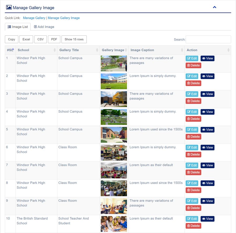 1. Login to System Admin Panel. 2. Select Manage Gallery Image sub menu under Media Gallery main menu from left side bar. 3. To Add/Create new Gallery Image click Add Gallery Image tab. 4. To Edit Gallery Image Click Edit button in the Gallery Image list. 5. To Delete Gallery Image Click Delete button in the Gallery Image List. 6. You are done with Manage Gallery Image feature.