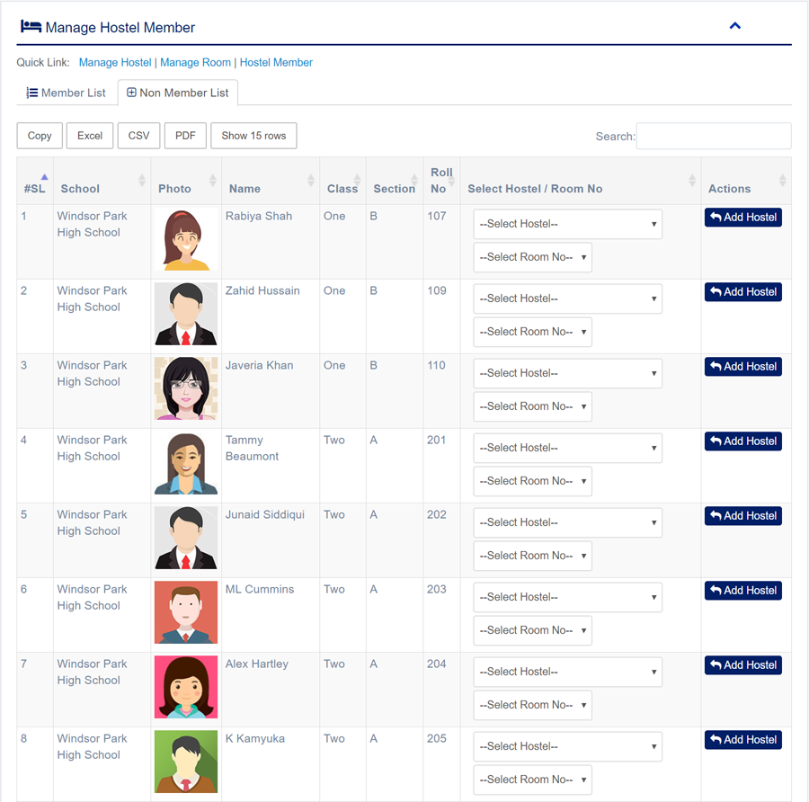 1. Login to System Admin Panel. 2. Select Hostel Member sub menu under Hostel main menu from left side bar. 3. To Add new Hostel Member click Non Member List tab. 4. Then click Add Hostel button to get add Hostel Member. 5. To Delete Hostel Member click delete button from Member List tab. 6. You are done with Hostel Member feature.
