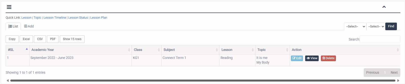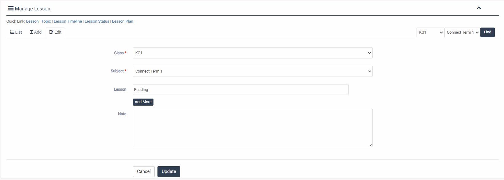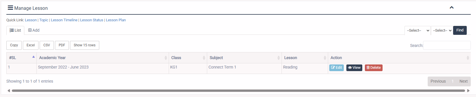 1. Login to System Admin Panel. 2. Select Lesson menu under Lesson Plan main menu from left side bar. 3. To Add/Create new Lesson click Add Lesson tab. 4. To Edit Lesson Click Edit button in the Lesson list. 5. To Delete Lesson Click Delete button in the Lesson List. 6. You are done with Manage Lesson feature.