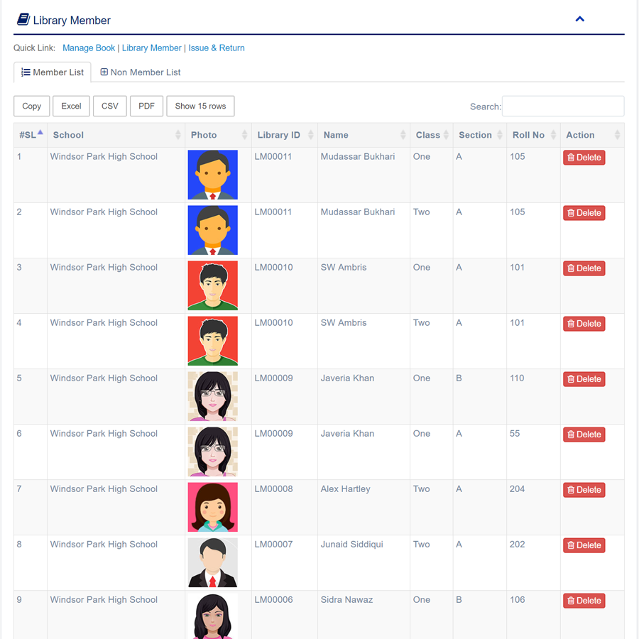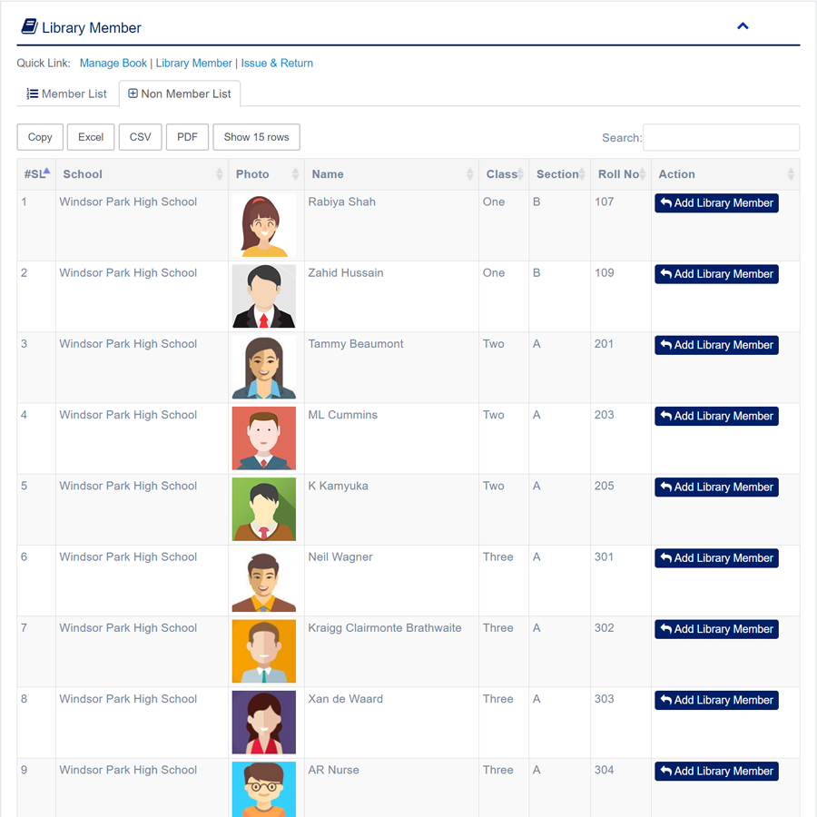 1. Login to System Admin Panel. 2. Select Library Member sub menu under Library main menu from left side bar. 3. To Add new Library Member click Non Member List tab. 4. Then click Add Library Member button to get add Library Member. 5. To Delete Library Member click delete button from Member List tab. 6. You are done with Library Member feature.