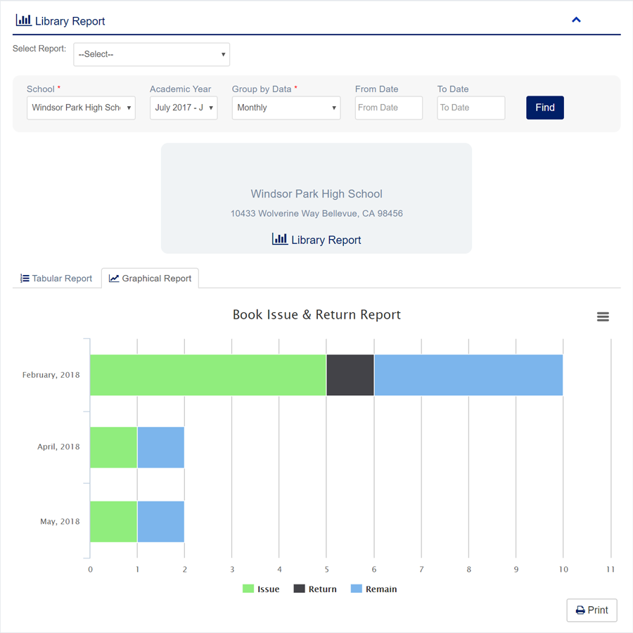1. Login to System Admin Panel. 2. Select Library Report sub menu under Report main menu from left side bar. 3. To View Library Report choose Academic Year, Group by Data, From Date & To Date. 4. Then click Find button and you will see Graphical Report. 4. To view Tabular Data click Tabular Report 6. You are done with Manage Library Report feature.