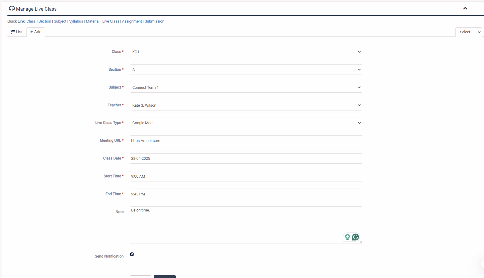 1. Login to System Admin Panel. 2. Select Class Lecture menu from left side bar. 3. To Add/Create new Lecture click Add tab and add the required info. 4. To Edit Lecture Click Edit button in the Lectuers list. 5. To Delete Lecture Click Delete button in the Teacher List. 6. You are done with Class Lecture feature.