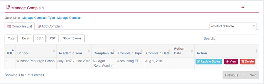 1. Login to System Admin Panel. 2. Select Complain sub menu under Complain main menu from left side bar. 3. To Add/Create new Complain click Add Complain tab. 4. To View Complain Click View button in the Complain list. 5. To Edit Complain Click Edit button in the Complain list. 6. To Delete Complain Click Delete button in the Complain List. 7. You are done with Manage Complain feature.