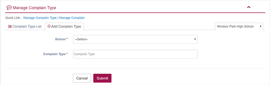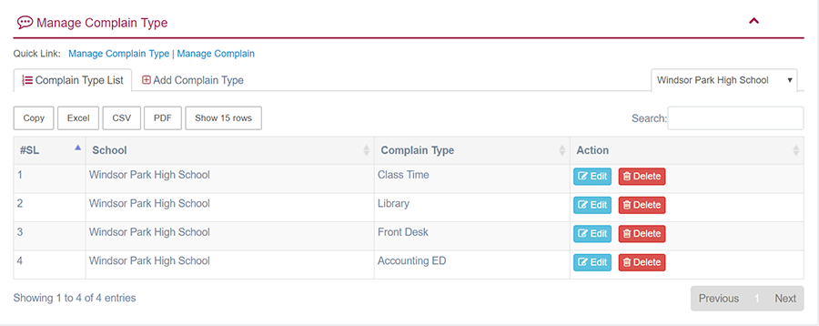 1. Login to System Admin Panel. 2. Select Complain Type sub menu under Complain main menu from left side bar. 3. To Add/Create new Complain Type click Add Complain Type tab. 4. To Edit Complain Type Click Edit button in the Notice list. 5. To Delete Complain Type Click Delete button in the Complain Type List. 6. You are done with Manage Complain Type feature.