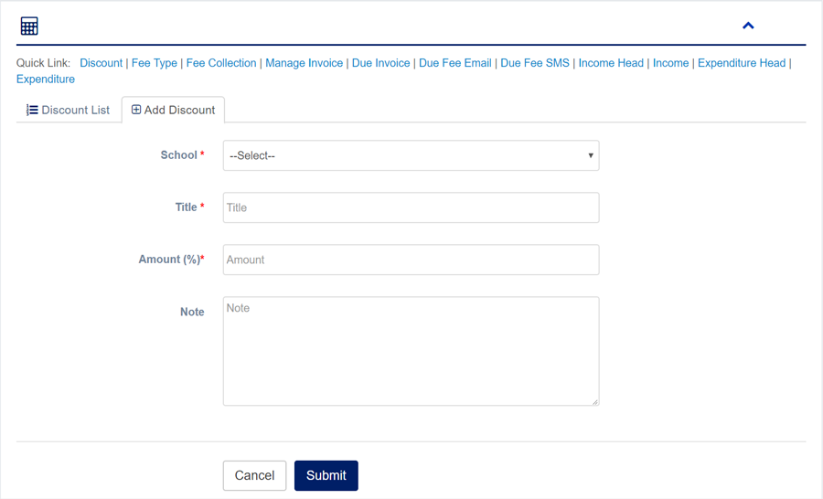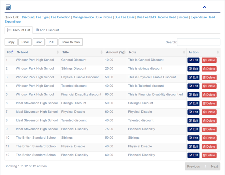 1. Login to System Admin Panel. 2. Select Discount sub menu under Accounting main menu from left side bar. 3. To Add/Create new Discount click Add Discount tab. 4. To Edit Discount Click Edit button in the Discount list. 5. To Delete Discount Click Delete button in the Discount List. 6. You are done with Manage Discount feature.