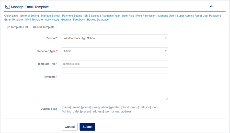 1. Login to System Admin Panel. 2. Select Email Template sub menu under Template menu from left side bar. 3. To add/create new Email Template click Add Email Template tab. 4. To edit Email Template Click Edit button in the Email Template list. 5. To Delete Email Template Click Delete button in the Email Template list. 6. You are done with Email Template feature.