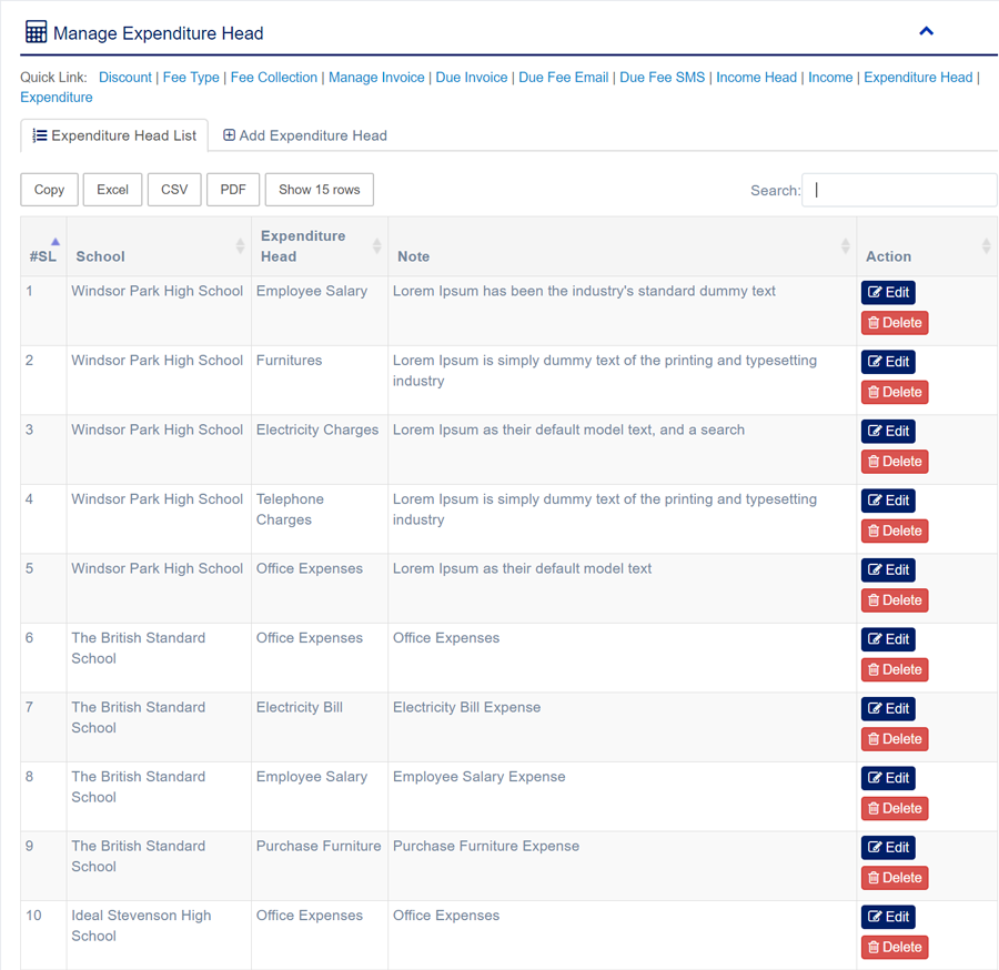 1. Login to System Admin Panel. 2. Select Expenditure Head sub menu under Accounting main menu from left side bar. 3. To Add/Create new Expenditure Head click Add Expenditure Head tab. 4. To Edit Expenditure Head Click Edit button in the Expenditure Head list. 5. To Delete Expenditure Head Click Delete button in the Expenditure Head List. 6. You are done with Manage Expenditure Head feature.