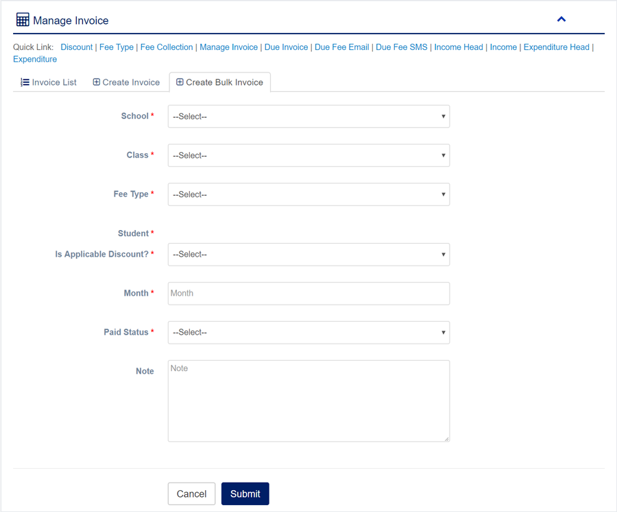 1. Login to System Admin Panel. 2. Select Fee Collection/ Invoice sub menu under Accounting main menu from left side bar. 3. To Create new Invoice click Create Invoice tab. 4. To Create Bulk Invoice click Create Bulk Invoice tab. 5. To View Invoice Click View button in the Invoice list. 6. To Edit Invoice Click Edit button in the Invoice list. 7. To Delete Invoice Click Delete button in the Invoice List. 8. You are done with Manage Fee Collection/Invoice feature.