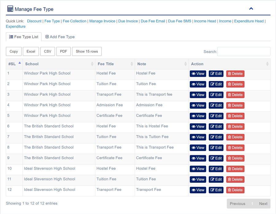 1. Login to System Admin Panel. 2. Select Fee Type sub menu under Accounting main menu from left side bar. 3. To Add/Create new Fee Type click Add Fee Type tab. 4. To Edit Fee Type Click Edit button in the Fee Type list. 5. To Delete Fee Type Click Delete button in the Fee Type List. 6. You are done with Manage Fee Type feature.