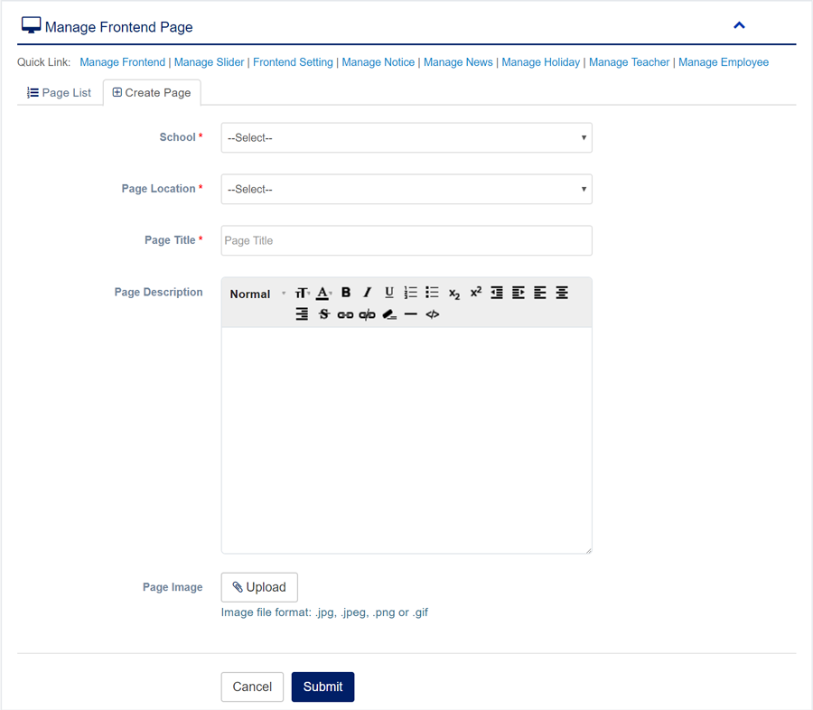 1. Login to System Admin Panel. 2. Select Manage Frontend sub menu under Frontend main menu from left side bar. 4. To Edit Frontend Pages Click Edit button in the Frontend Page list. 5. To View Frontend Page Click View button in the Frontend Page List. 6. You are done with Manage Frontend Pages feature.