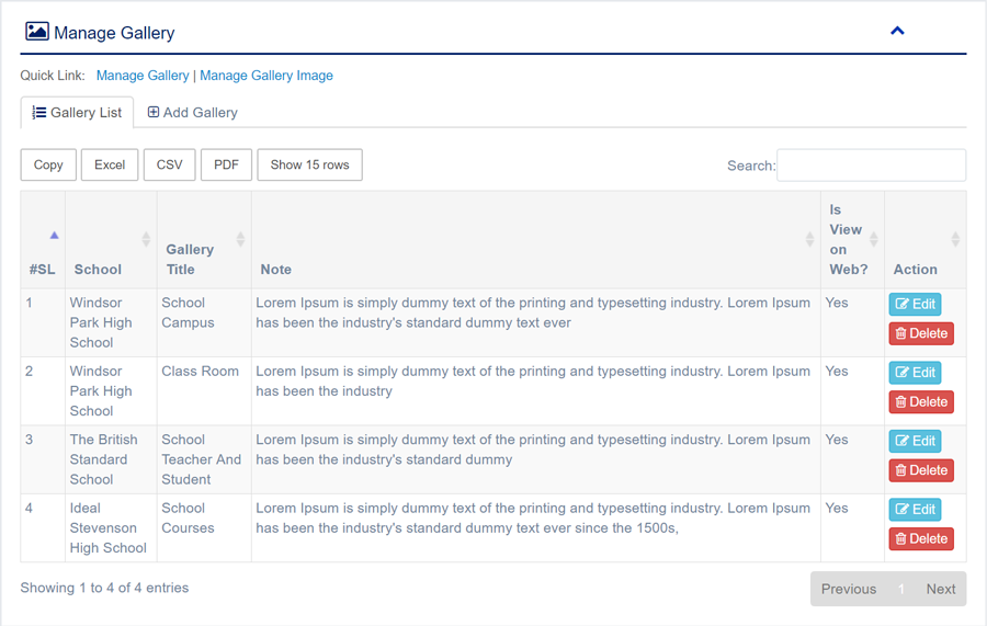1. Login to System Admin Panel. 2. Select Manage Gallery sub menu under Media Gallery main menu from left side bar. 3. To Add/Create new Gallery click Add Gallery tab. 4. To Edit Gallery Click Edit button in the Gallery list. 5. To Delete Gallery Click Delete button in the Gallery List. 6. You are done with Manage Gallery feature.