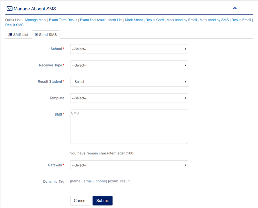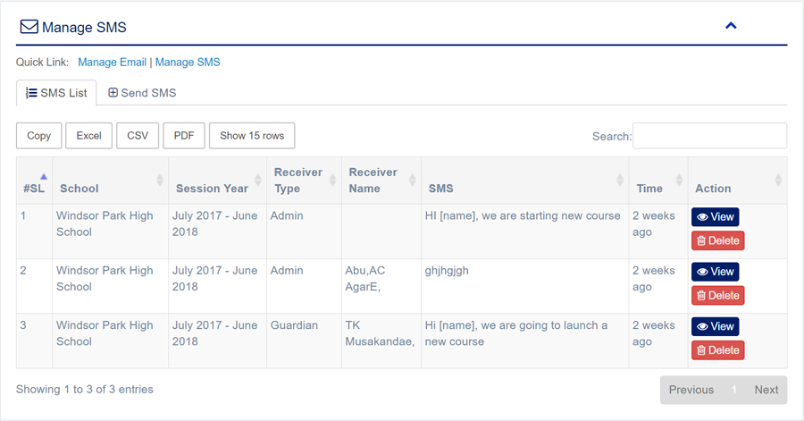 1. Login to System Admin Panel. 2. Select SMS sub menu under Mail & SMS main menu from left side bar. 3. To send new SMS click Send SMS tab. 4. To Delete SMS Click Delete button in the SMS List. 5. You are done with Manage SMS feature.