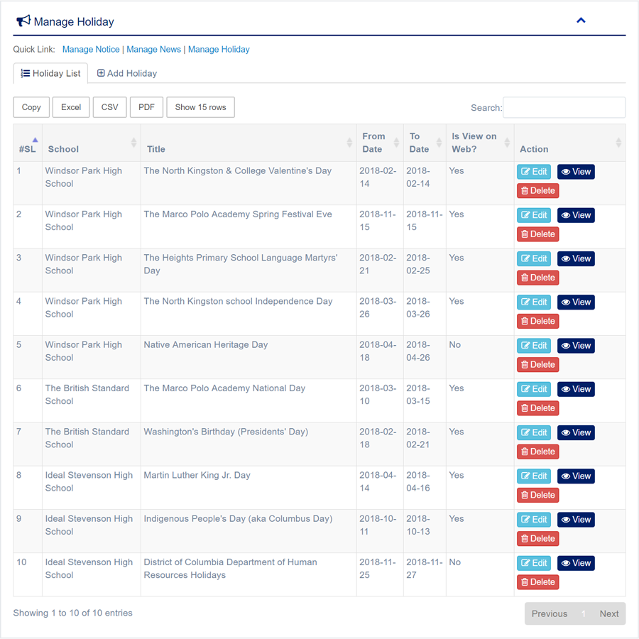 1. Login to System Admin Panel. 2. Select Holiday sub menu under Announcement main menu from left side bar. 3. To Add/Create new Holiday click Add Holiday tab. 4. To View Holiday Click View button in the Holiday list. 5. To Edit Holiday Click Edit button in the Holiday list. 6. To Delete Holiday Click Delete button in the Holiday List. 7. You are done with Manage Holiday feature.