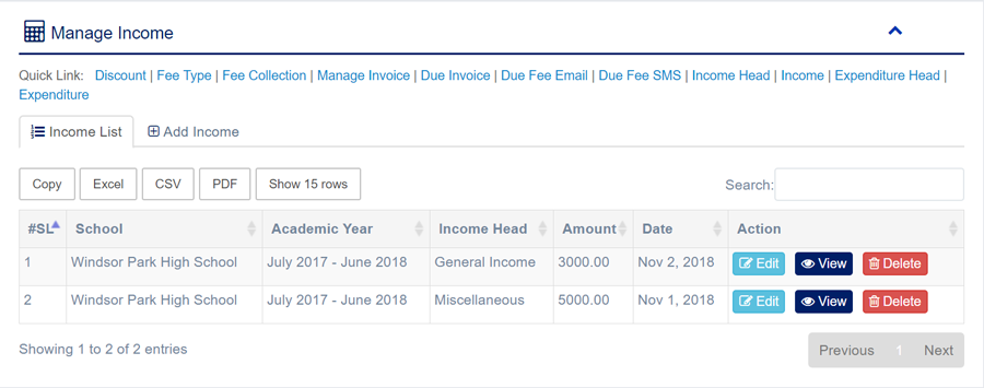 1. Login to System Admin Panel. 2. Select Income sub menu under Accounting main menu from left side bar. 3. To Add/Create new Income click Add Income tab. 4. To View Income Click View button in the Income list. 5. To Edit Income Click Edit button in the Income list. 6. To Delete Income Click Delete button in the Income List. 7. You are done with Manage Income feature.