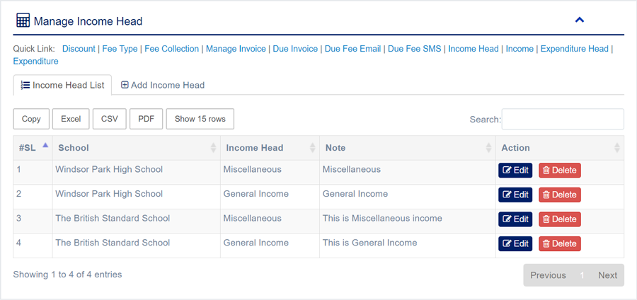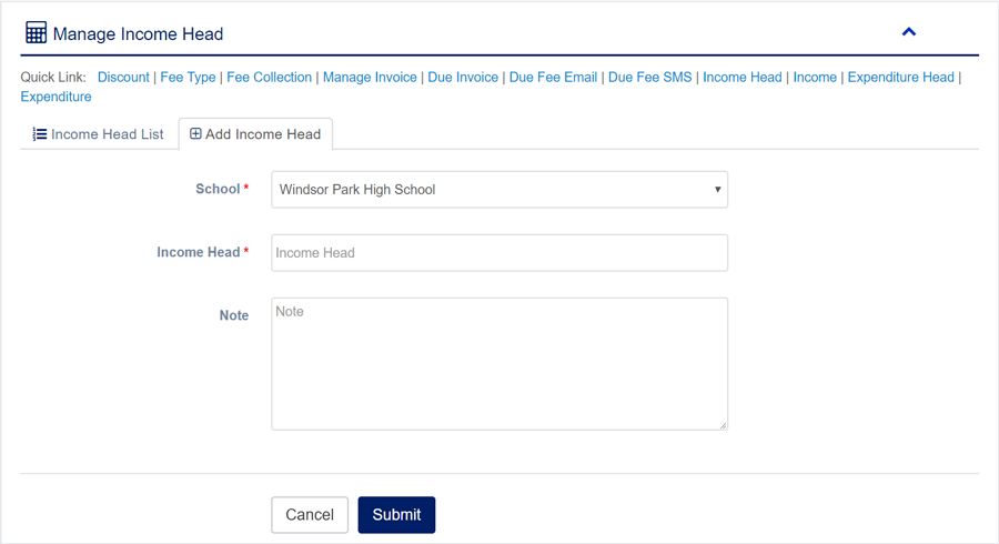 1. Login to System Admin Panel. 2. Select Income Head sub menu under Accounting main menu from left side bar. 3. To Add/Create new Income Head click Add Income Head tab. 4. To Edit Income Head Click Edit button in the Income Head list. 5. To Delete Income Head Click Delete button in the Income Head List. 6. You are done with Manage Income Head feature.