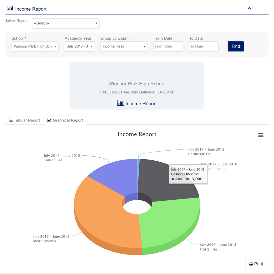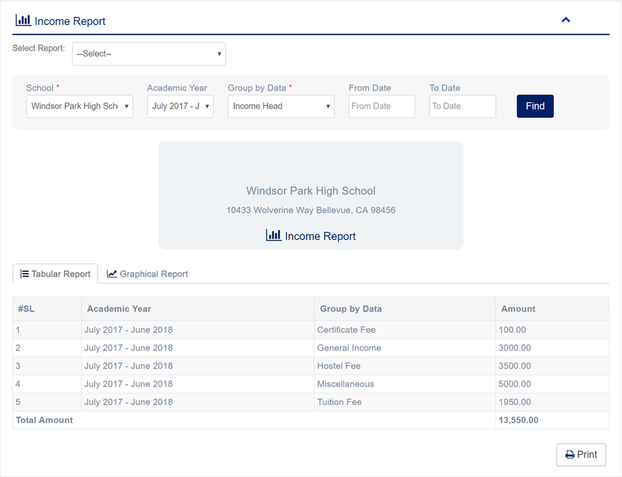 1. Login to System Admin Panel. 2. Select Income Report sub menu under Report main menu from left side bar. 3. To View Income Report choose Academic Year, Group by Data, From Date & To Date. 4. Then click Find button and you will see Graphical Report. 4. To view Tabular Data click Tabular Report 6. You are done with Manage Income Report feature.