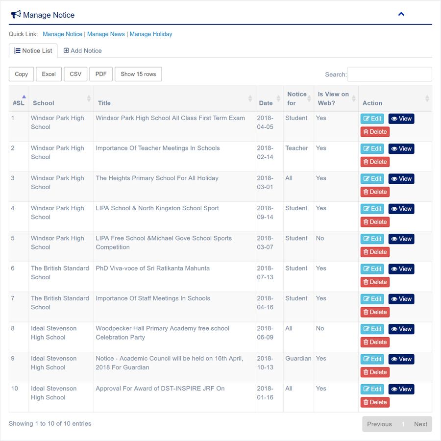 1. Login to System Admin Panel. 2. Select Notice sub menu under Announcement main menu from left side bar. 3. To Add/Create new Notice click Add Notice tab. 4. To View Notice Click View button in the Notice list. 5. To Edit Notice Click Edit button in the Notice list. 6. To Delete Notice Click Delete button in the Notice List. 7. You are done with Manage Notice feature.