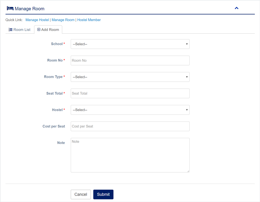 1. Login to System Admin Panel. 2. Select Manage Room sub menu under Transport main menu from left side bar. 3. To Add/Create new Room click Add Room tab. 4. To Edit Room Click Edit button in the Room list. 5. To Delete Room Click Delete button in the Room List. 6. You are done with Manage Room feature.