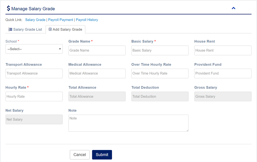 1. Login to System Admin Panel. 2. Select Salary Grade sub menu under Payroll main menu from left side bar. 3. To Add/Create new Salary Grade click Add Salary Grade tab. 4. To Edit Salary Grade Click Edit button in the Salary Grade list. 5. To Delete Salary Grade Click Delete button in the Salary Grade List. 6. You are done with Manage Salary Grade feature.