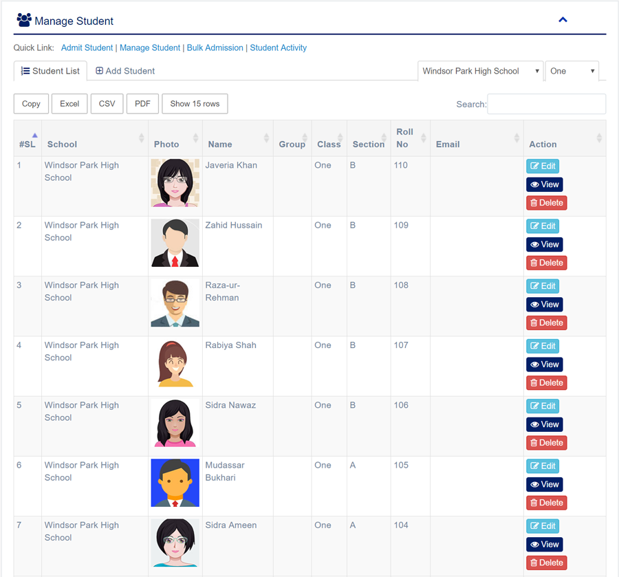 1. Login to System Admin Panel. 2. Select Student sub menu under Student main menu from left side bar. 3. To Add/Create new Student click Add Student tab. 4. To Edit Student Click Edit button in the Student list. 5. To Delete Student Click Delete button in the Student List. 6. You are done with Manage Student feature.