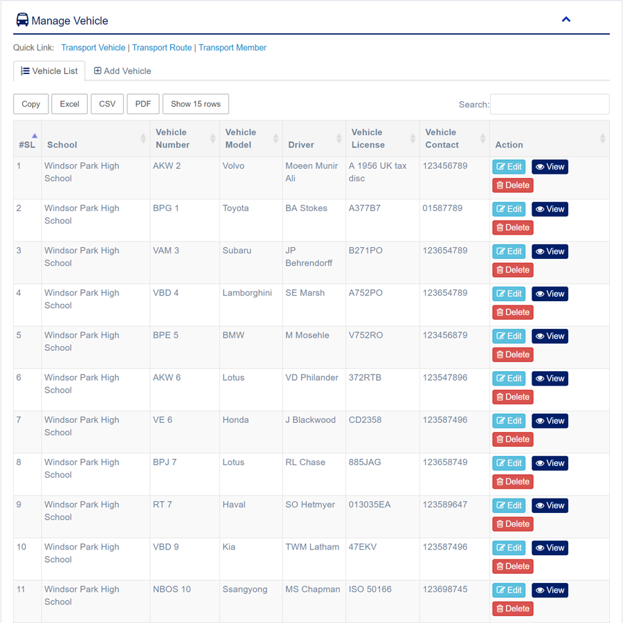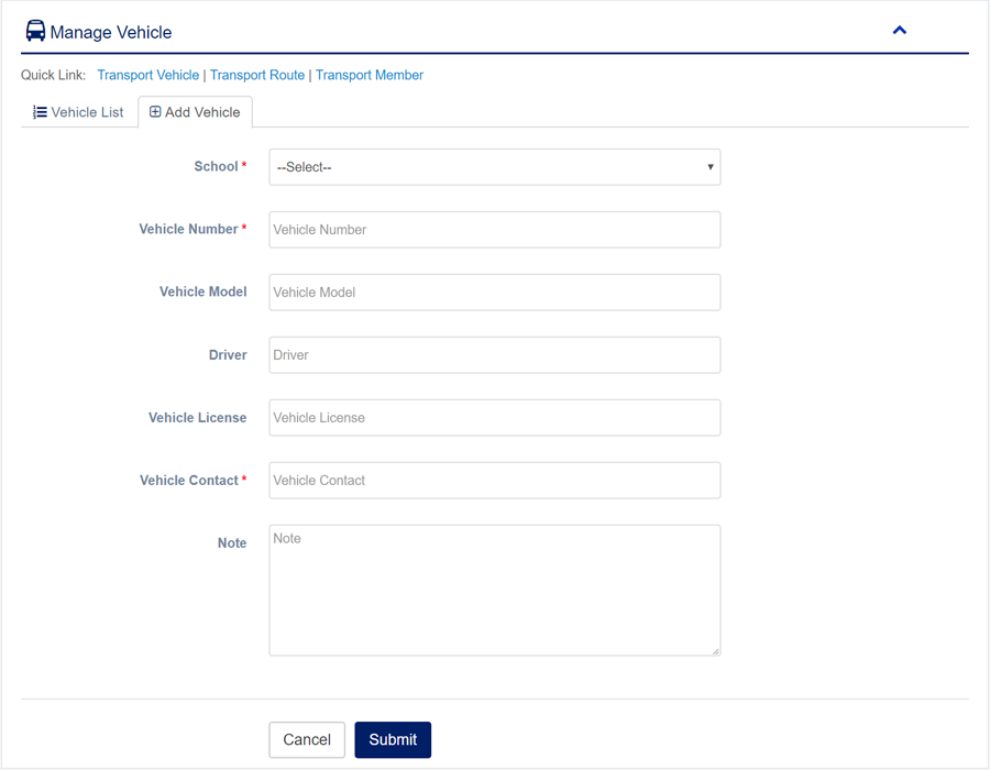 1. Login to System Admin Panel. 2. Select Manage Vehicle sub menu under Transport main menu from left side bar. 3. To Add/Create new Vehicle click Add Vehicle tab. 4. To Edit Vehicle Click Edit button in the Vehicle list. 5. To Delete Vehicle Click Delete button in the Vehicle List. 6. You are done with Manage Vehicle feature.