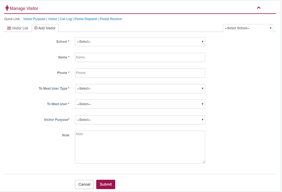 1. Login to System Admin Panel. 2. Select Visitor Purpose sub menu under Front Office menu from left side bar. 3. To add/create new Visitor Purpose click Add Visitor Purpose tab. 4. To edit Visitor Purpose Click Edit button in the Visitor Purpose list. 5. To Delete Visitor Purpose Click Delete button in the Visitor Purpose list. 6. You are done with Visitor Purpose feature.