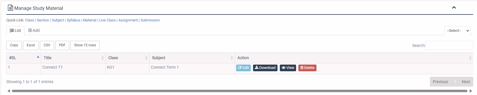 1. Login to System Admin Panel. 2. Select Study Material sub menu under Academic main menu from left side bar. 3. To Add/Create new Study Material click Add Study Material tab. 4. To Edit Study Material Click Edit button in the Study Material list. 5. To Delete Study Material Click Delete button in the Study Material List. 6. You are done with Manage Study Material feature.