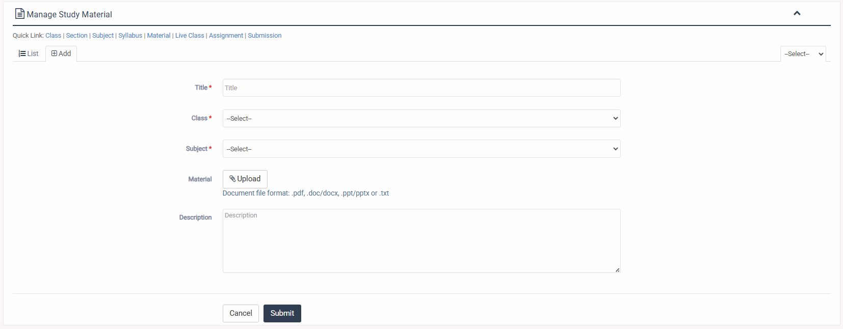 1. Login to System Admin Panel. 2. Select Submission sub menu under Academic main menu from left side bar. 3. To Add/Create new Submission click Add tab. 4. To Edit Submission Click Edit button in the Study Material list. 5. To Delete Submission Click Delete button in the Study Material List. 6. You are done with Manage Submission feature.