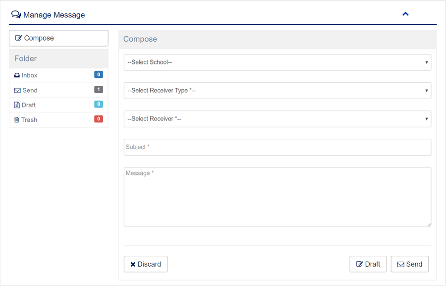 1. Login to System Admin Panel. 2. Select Message main menu from left side bar. 3. Click Compose button to write new message. 3. Click Inbox button to see incoming message. 3. Click Send button to see outgoing message. 3. Click Draft button to see Drafts message. 3. Click Trash button to see Trashed message. 6. You are done with Message feature.