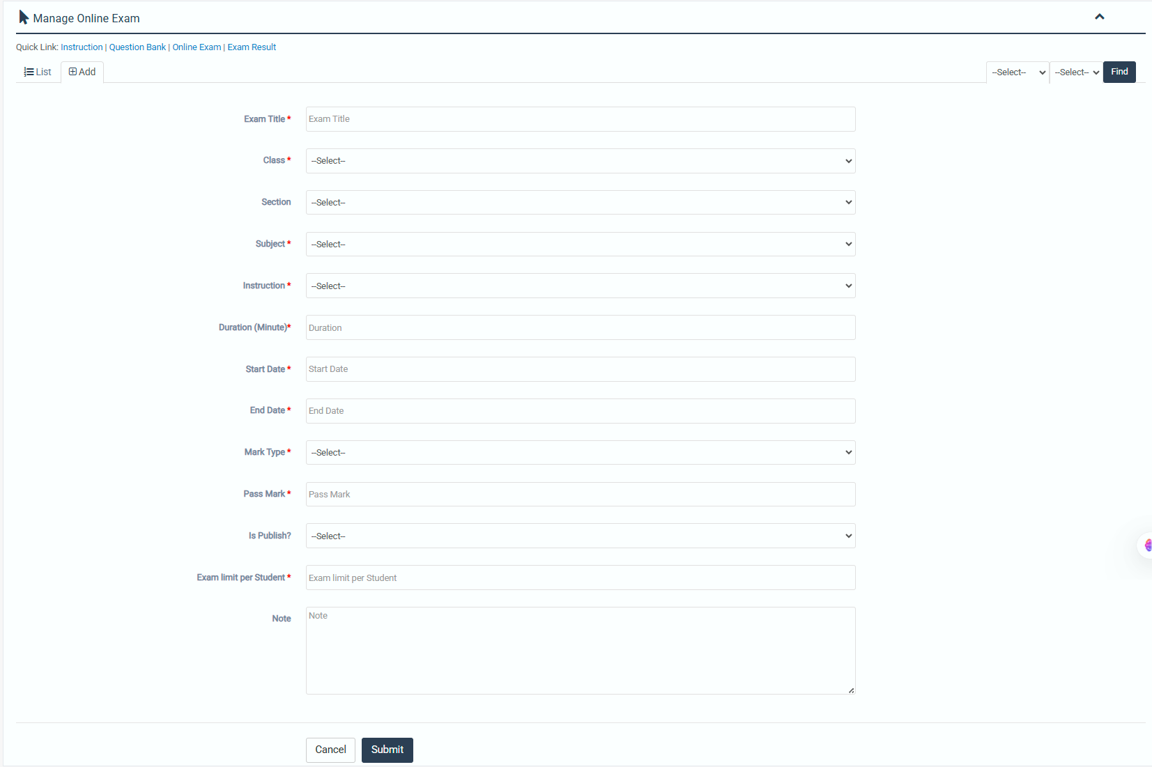 1. Login to System Admin Panel. 2. Select Online Exam sub menu under Online Exam main menu from left side bar. 3. To Add/Create new Online Exam click Add tab. 4. To Edit Online Exam Click Edit button in the Online Exam list. 5. To Delete Discount Click Delete button in the Online Exam List. 6. You are done with Manage Online Exam feature.
